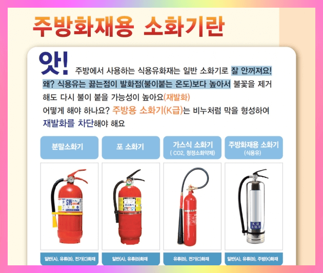 ABC분말 소화기를 써도 일시적으로는 불이 꺼진 것처럼 보이지만 재발화의 가능성을 항상 가지고 있다고 하는데요 식용유 등 기름으로 인한 화재가 발생했을 때 당황하여 물을 뿌리는 경우가 있는데 이는 불을 끄는 것이 아니라 확산시킬 수 있으니 각별히 주의하셔야 합니다.