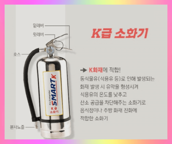K급 소화기는 일반적으로 주방용 소화기가 아니라 유류, 윤활유, 페인트, 라커 등과 같은 화재를 진압하기 위한 소화기를 말하는데요 주방에서는 기름의 과열로 인한 화재가 많이 발생해서 진화용으로도 의미가 있겠습니다. K급 소화기에는 탄산나트륨과 탄산칼륨 등이 포함된 강화액이 있어 식용유화재 등에 뿌려지면 비누 거품을 만드는데 이는 가연성 액체의 표면을 덮어 산소를 차단시켜 질식효과로 화재를 진화가 가능하게 됩니다.
