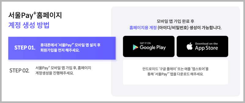 홈페이지 계정(아이디/비밀번호)은 서울 Pay+ 모바일 앱 로그인 시에는 사용하실 수 없으니 모바일앱을 다운로드 받아야 합니다.